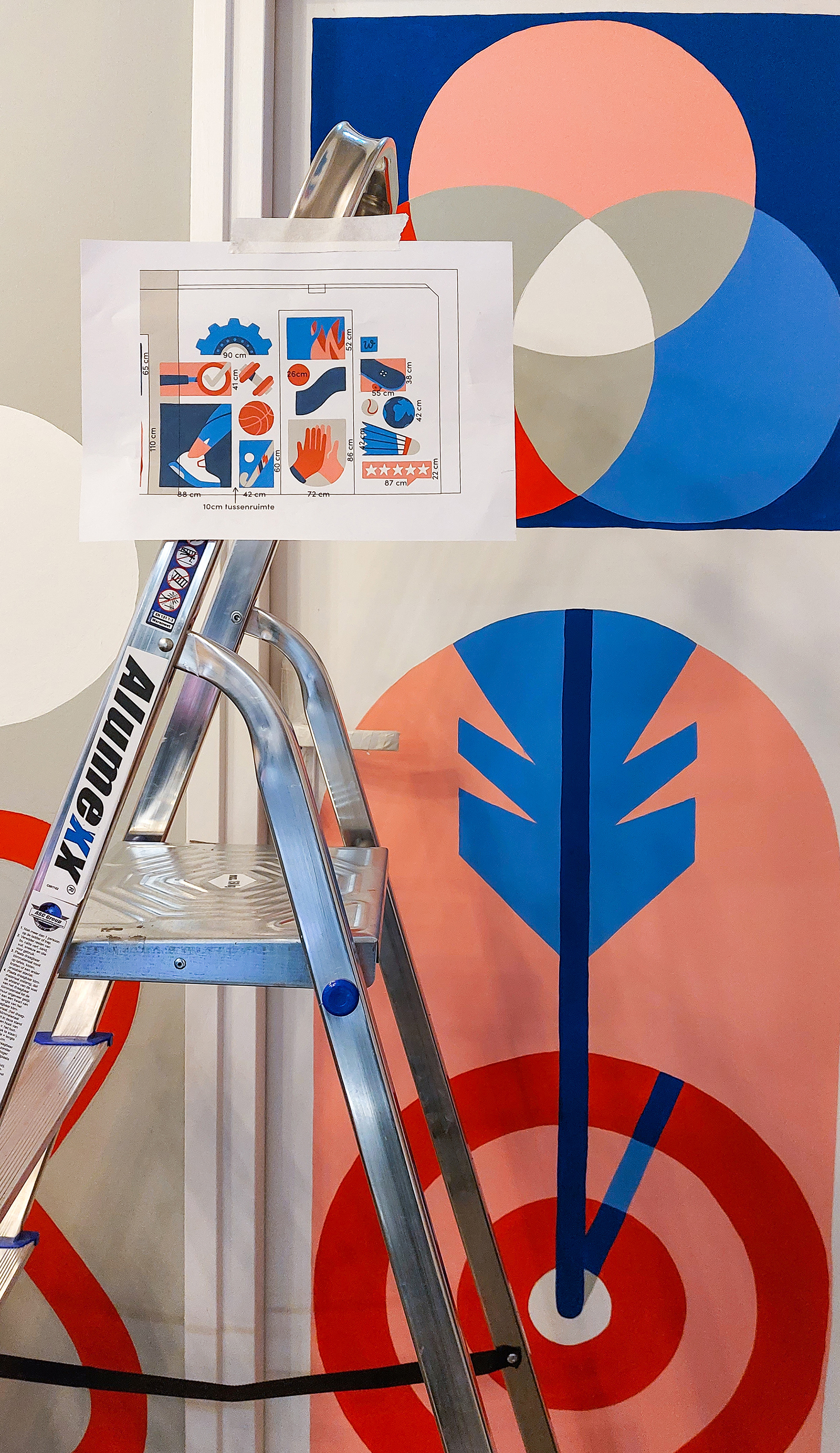 Voor het Intersport kantoor in Amsterdam mochten wij, gebaseerd op hun kernwaarden, een muurschildering ontwerpen. We konden de kernwaarden vrij interpreteren en samen met enkele sportieve elementen tot een mooie compositie verwerken. Het schilderen op deuren en de illustraties laten doorlopen in de hoeken was een leuke uitdaging, net als het feit dat we over twee verschillende achtergrondkleuren hebben gewerkt.