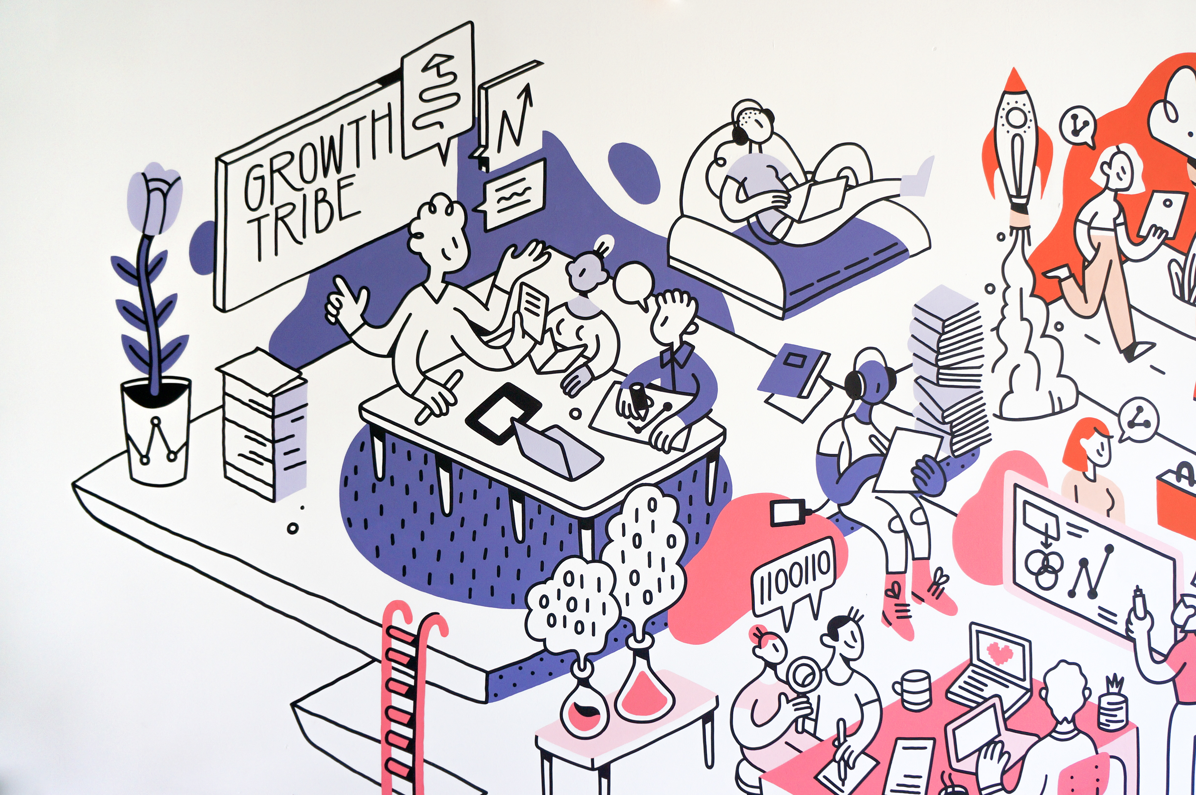 Growth Tribe is a company in Amsterdam which delivers solutions that empower both individuals and companies to grow and stay competitive in a rapidly changing world. They offer physical classes in their office in Amsterdam but also online courses. This mural represents the three ways of learning they work with, illustrated on three different 'platforms’.