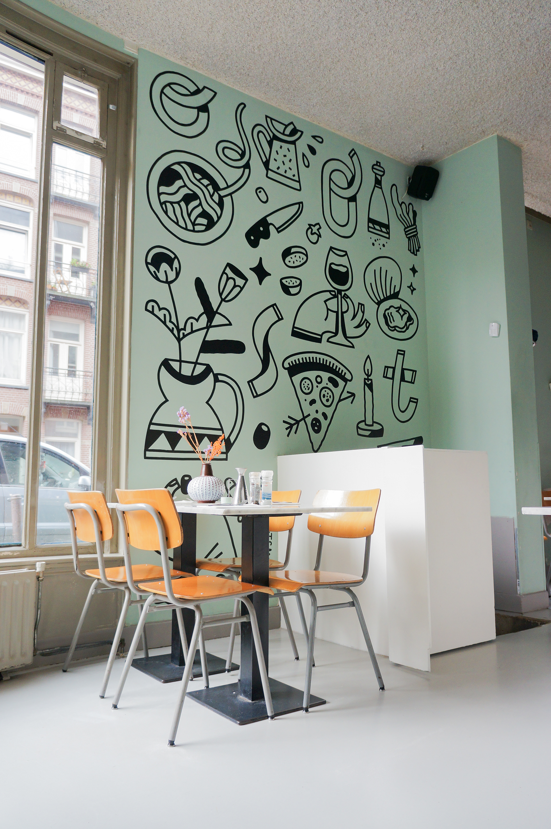 Muurtekening bij Restaurant Oost in Amsterdam, met onder andere een paar van hun typische gerechten. Ze hebben fantastische pizza’s, pasta’s, antipasti en natuurlijk ook heerlijk Italiaanse wijn. Wij komen er beide graag eten, dus het was extra leuk, en een eer, om hier een muurschildering te kunnen maken!
